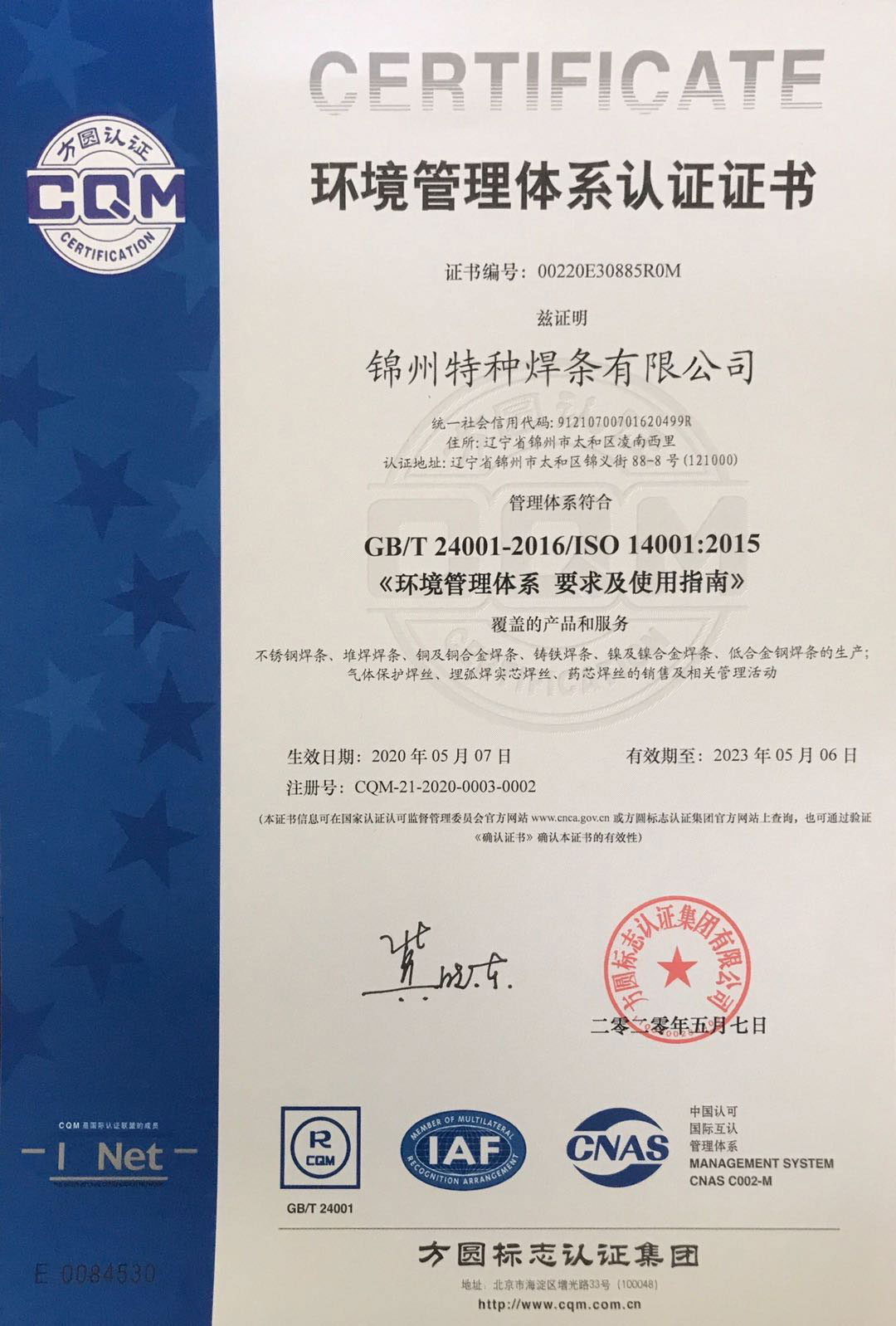 認(rèn)證名稱:環(huán)境管理體系認(rèn)證證書(shū)